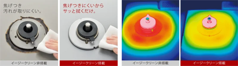 イージークリーンとは、天板の温度を抑えて、焦げ付きにくくする機能です。